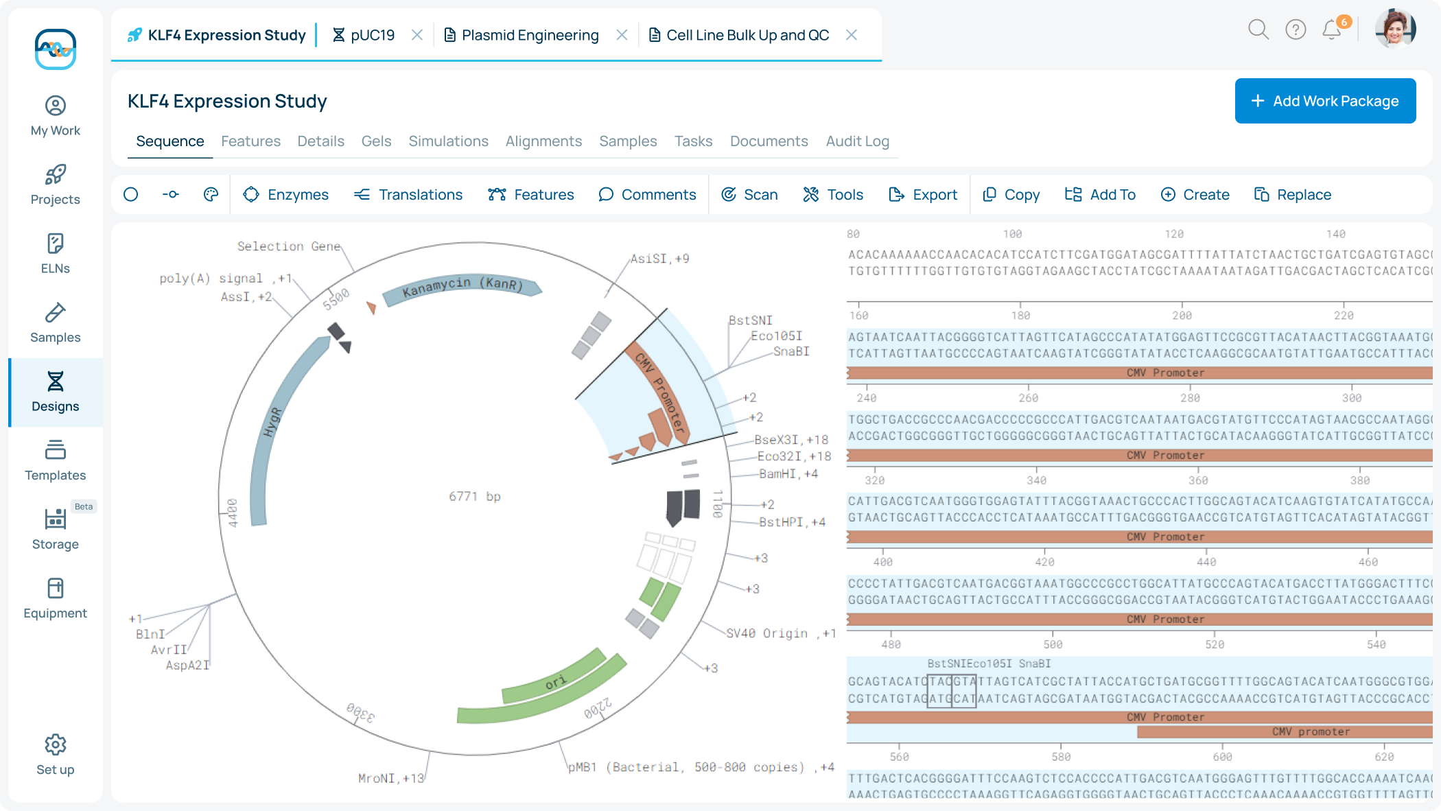 Visualise and manipulate DNA sequences within the same interface as your lab notes. This eliminates "tab-jumping" and ensures your most current design is always the one being referenced by the team.