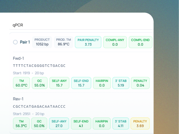 The platform includes intelligent DNA primer design with automated melting temperature calculations. Once designed, primers are automatically available for selection in your PCR protocols, eliminating the risk of transcription errors.