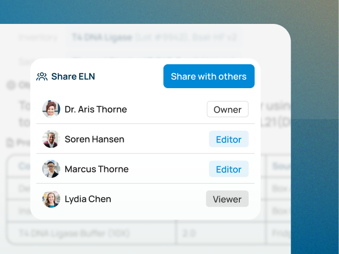 Manage projects where multiple scientists contribute to the same goal simultaneously, allowing for real-time review, feedback and commentary, seamless handovers and shared visibility of project-wide progress.