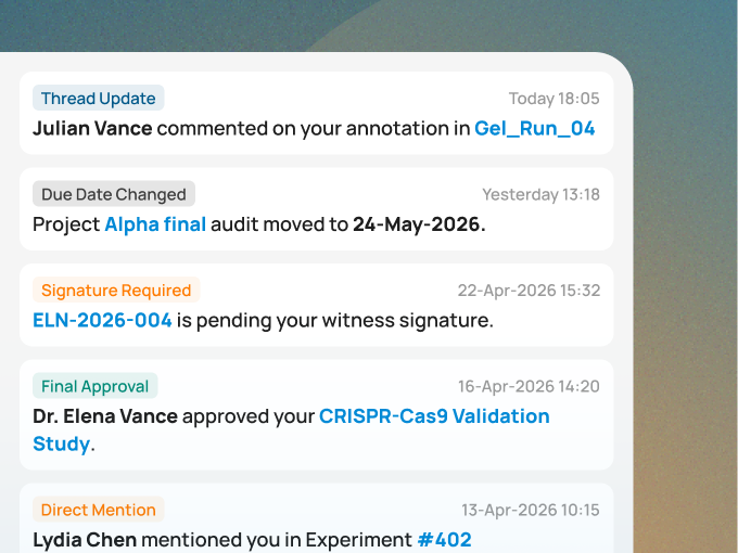 Every decision, signature, and edit is captured in a permanent, searchable record, simplifying assembly of data for publication, patent filing, or regulatory audits by providing a complete "biography" of the project.